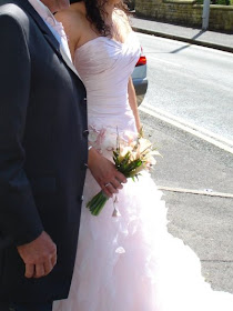 A dress which is both form fitted and full at the bottom like a trumpet gown needs a bouquet with equal drama and verve. A floral arrangement with mixed blossoms will work very well. A generally roundish shape would be nice, but it should not be as symmetrical as the classic prim nosegay. Exuberance is the name of the game here! The bouquet for a sexy trumpet gown should feature some splashy touches like peacock feathers, crystal accents, or even a marabou ruff. When your dress has a lot of spirit, your wedding flowers should too.